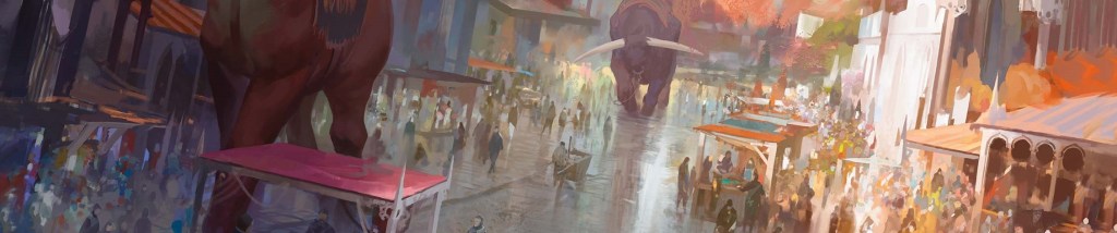 The party splits up as Tilij is immediately distracted by a banana bread vendor. Vesfaah sets out to search the area for evidence of the Rakdos performers and Tal Hil searches the area for potential escape routes (of which there are many, being a high-traffic market). Yukihyo sets out to begin interviewing the nearby vendors about the escape this afternoon. Tilij ends up buying as much banana bread as he can carry – 10g worth! Vesfaah and Tal Hil find some traces of the performance group, but not much that was terribly useful. Right around the time that the others head back to Yukihyo to join in the questioning, Yukihyo found a goblin quill vendor named Noggra who actually has some useful information. Vesfaah offers up a bribe to coerce the information out of Noggra, and for the princely sum of 10g, she tells the party that Krenko does a lot of business with a local Izzet arms dealer named Falish. Falish is fairly secretive and most people don’t know the location of her lab, but Noggra scribbles down instructions on how to find it on a scrap of paper and passes it to Vesfaah.