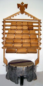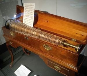 This instrument has a hand-cranked wooden wheel which strikes strings as it turns. Along the side of this bulky instrument is a keyboard, which when pressed changes the tautness, and thus the pitch, of the strings.