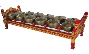 One of the lead instruments in Javanese Gamelan music. The Bonang is composed of a double-row of horizontally mounted tuned bronze kettle gongs and is usually played with two padded beaters (tabuh). All of the kettles have a central boss, but around it the lower-pitched ones have a flattened head, while the higher ones have an arched one.