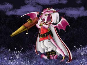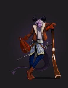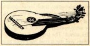 Two strings along the handle of what looks like a large mallet. The strings are struck with a bow much like a member of the viol family, but it creates a different sound and is more appropriate for a far-traveler.