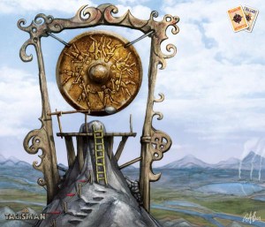 A very flat drum with small metal discs inserted around the edge. These discs clap together as the handheld drum is hit to create a jingling sound along with the drum’s bass sound. “Tantan” is the Forgotten Realms name for the instrument and it does not appear to have any relation to the tan-tan, a large drum from Brazil.